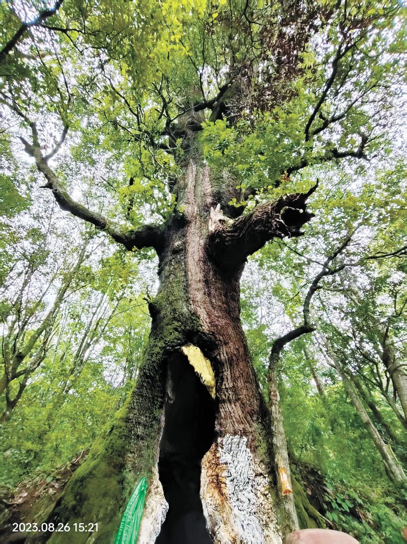 这株柳杉树高达38米,因为村民祭拜、燃烧香烛,树体上烧了一个较大的空洞。现在柳杉下不仅加装了围栏,隔绝了人为活动的直接干扰,还对树体空腐层进行了清理,喷施了杀菌、杀虫的药剂,并作了防腐处理。